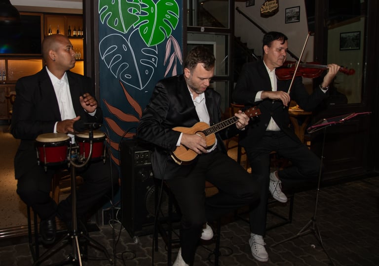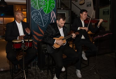 Se fazemos negócios com leveza, não poderia faltar uma banda havaiana Ao Vivo, formada por Bongo, Ukulelê e Violino tocando clássicos como "What a Wonderful World" e "Beautiful Day". Aquecemos corações e almas para que negócios fluam com leveza e impacto!